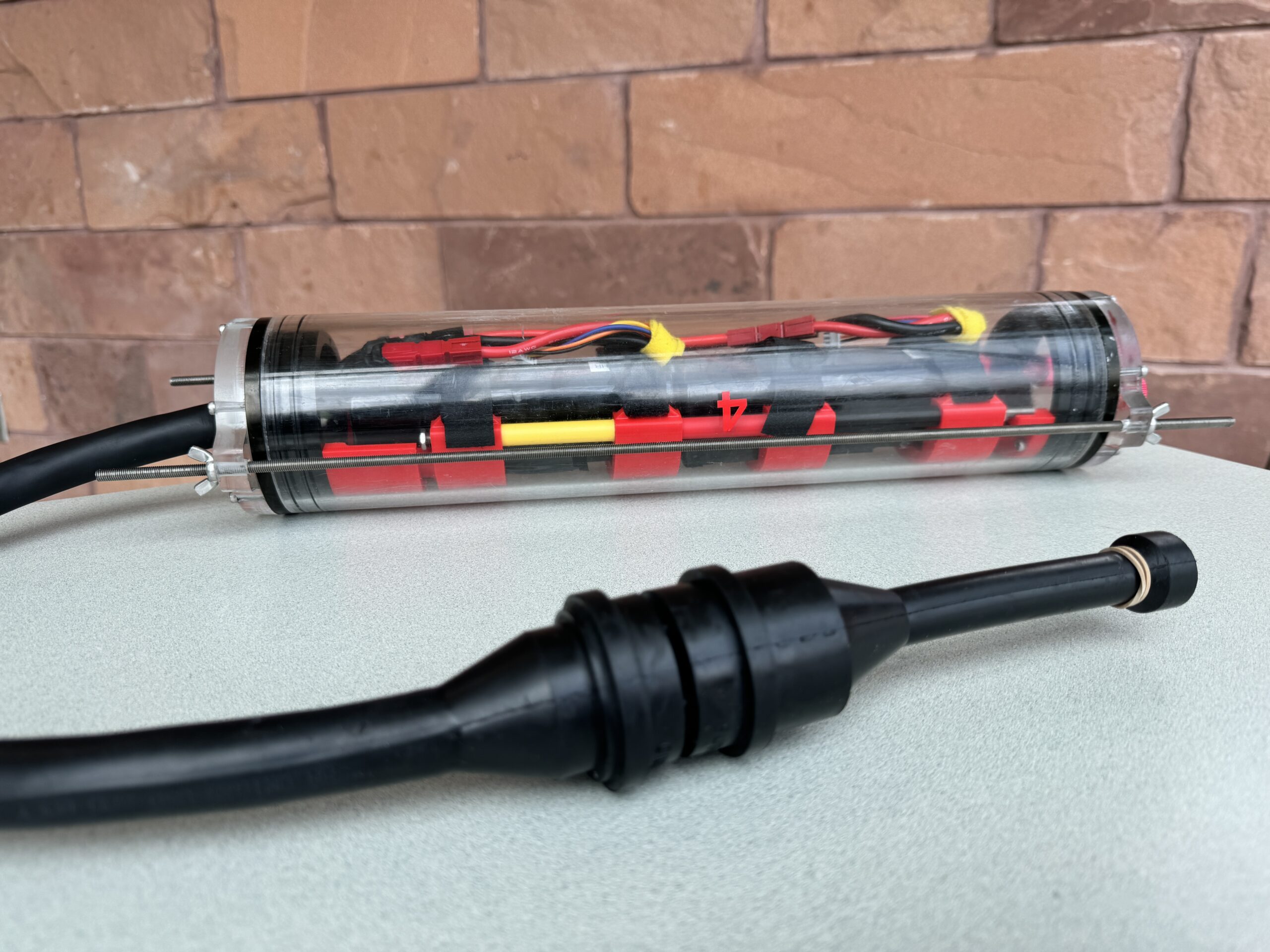 To address these limitations, this year we’ve relocated the batteries to external cylindrical battery hulls connected by SubConns. This solution eliminates all aforementioned risks by providing adequate space for the batteries to prevent punctures and remove them from the other electronics’ proximity, mitigating thermal and water damage concerns. This new configuration additionally makes battery swaps seamless as two full sets of enclosures and batteries allow for hot-swapping, ensuring a continuous power supply with one battery always active.