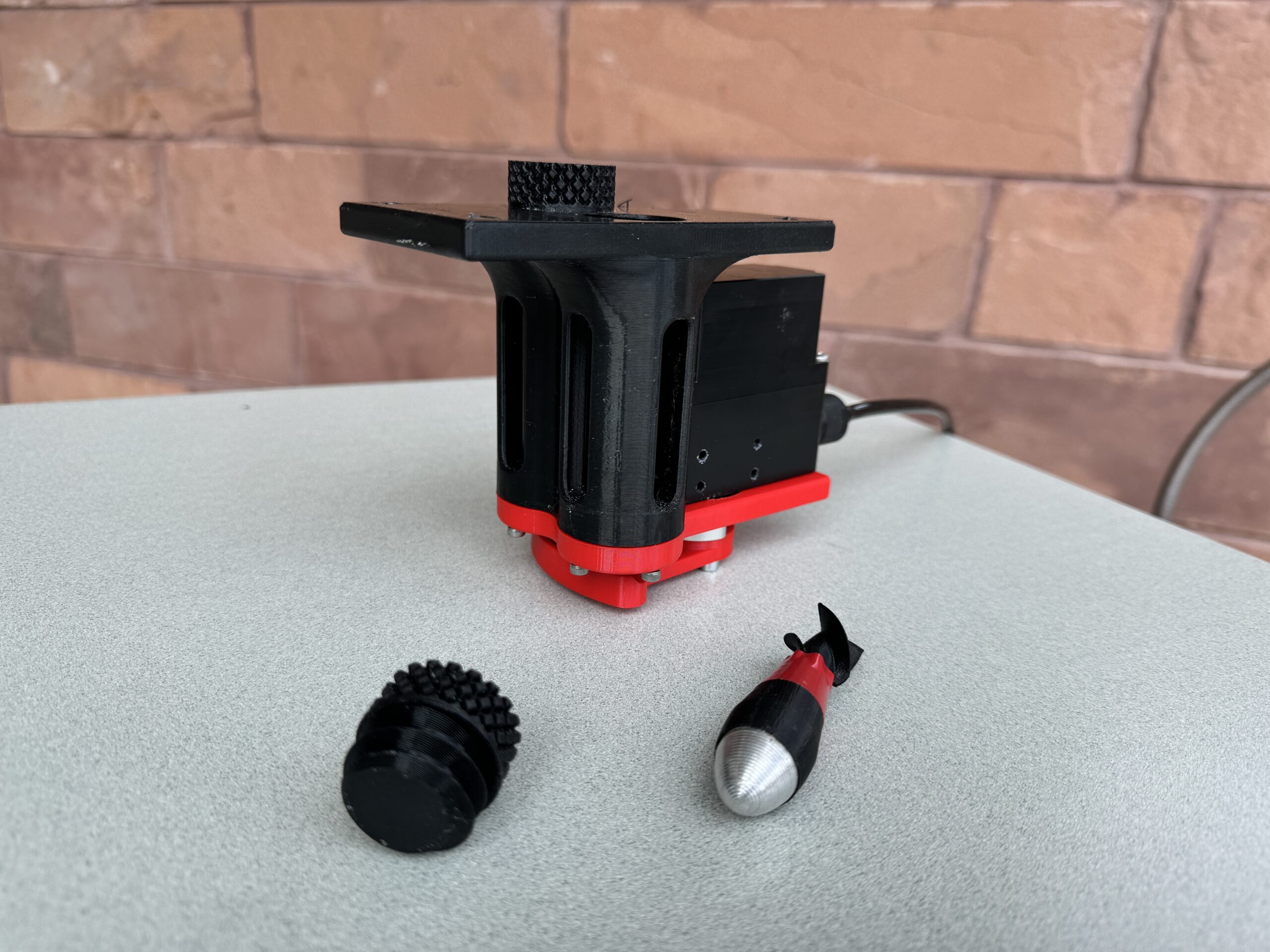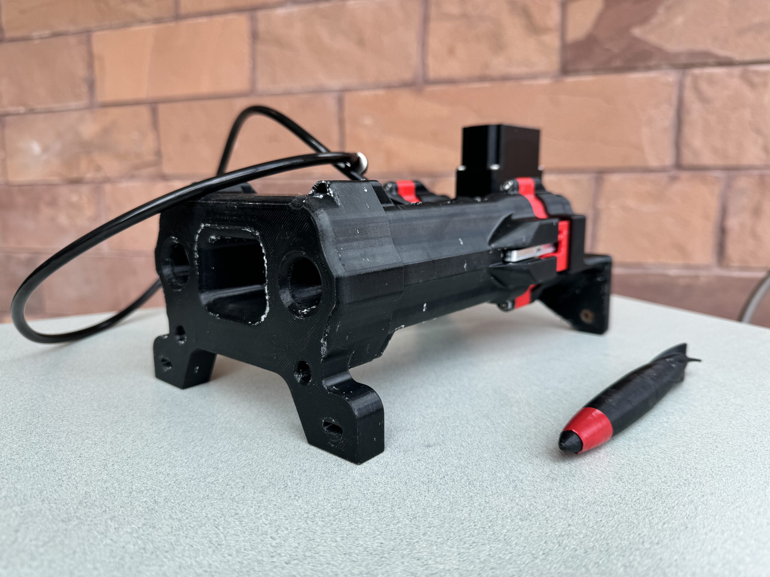 The spring-propelled torpedo system is actuated by a single high-torque waterproof servo using a custom servo horn. A metal rod opens a series of links connected to two metal levers that releases a spring plate and shoots the torpedoes. Fires two torpedoes accurately to distances up to 3 meters. Torpedoes are balanced internally with foam and weights to improve flight stability, but primarily 3D printed.