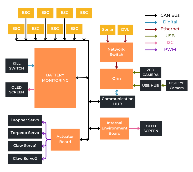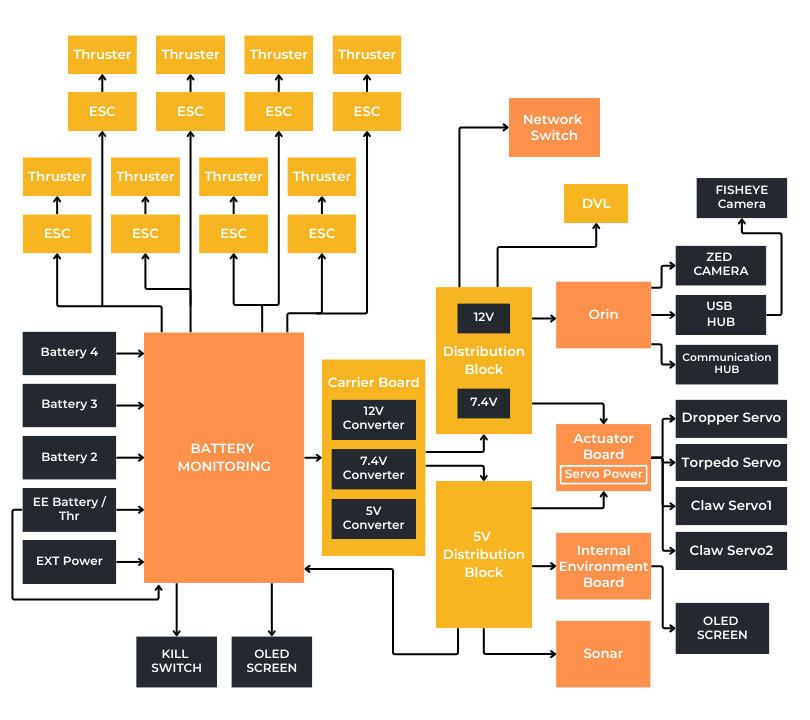 Arctos’ electrical system provides power and communication between the onboard computer and all subsystems. Power from the batteries are handled safely by a battery monitoring board and then passed to thruster ESCs and voltage converter boards. From the converter board, all other systems are powered like the actuator board, the internal environment board, and the jetson orin via terminal blocks.