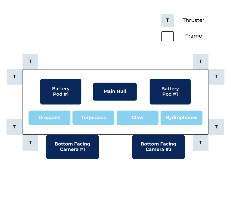 Arctos is composed of an aluminum hull with two entry points that contains all critical electronics for the robots function. The hull is surrounded by a frame to support subsystems like Arctos’ torpedo launcher, claw, droppers, sonar, doppler velocity log, external cameras, and buoyancy pods. The original design was meant to emulate an x-wing, but the form factor has been simplified.