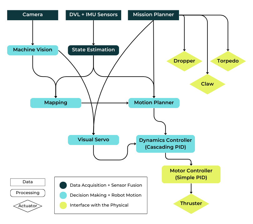 Controls Arctos’ decision-making via a custom behaviour tree. By looking at sensor data from our cameras, DVL, and IMU, the mission planner runs every feasible calculation required for decision making. The mission planner will simply listen for the required information and launch the necessary missions as determined by the tree.
